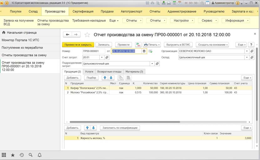 Учет выпускаемой продукции производится, как в основных, так и в дополнительных единицах измерения, пересчитываемых через коэффициент. Параметры выпуска продукции имеют связь с качественными показателями сырья, например, % жира, % белка, что позволяет при расчете списания сырья на выпуск продукции корректно рассчитывать нормативы расхода. Нормативы могут быть заданы, как числовым методом, так и в виде формул или таблиц, зависящих от параметров.