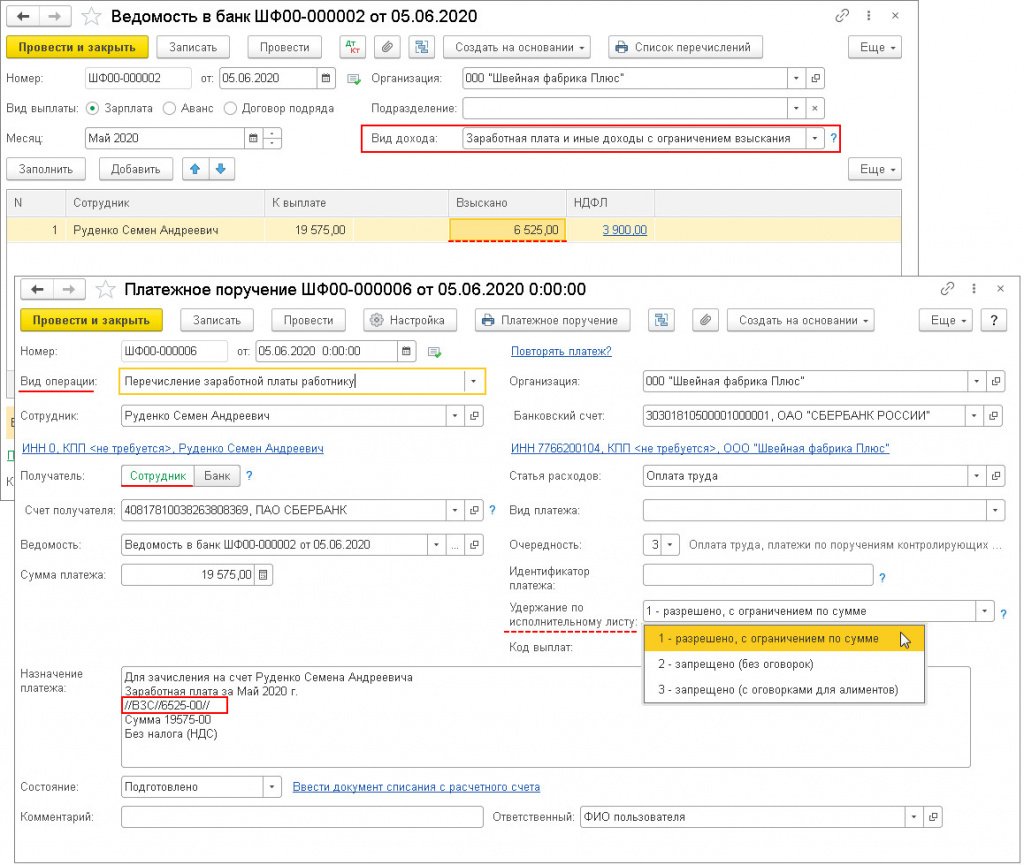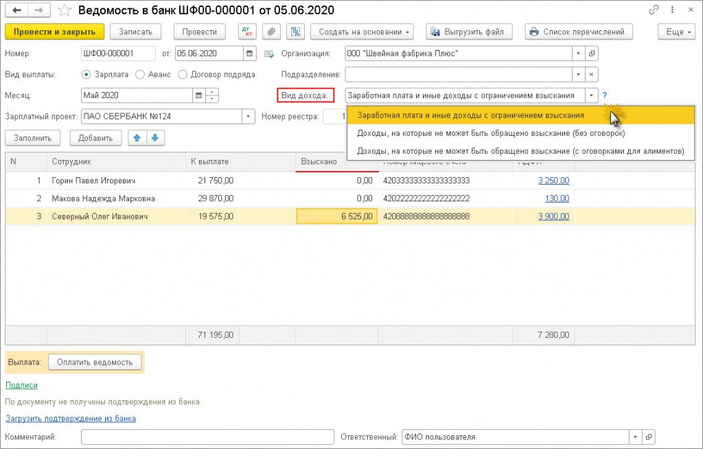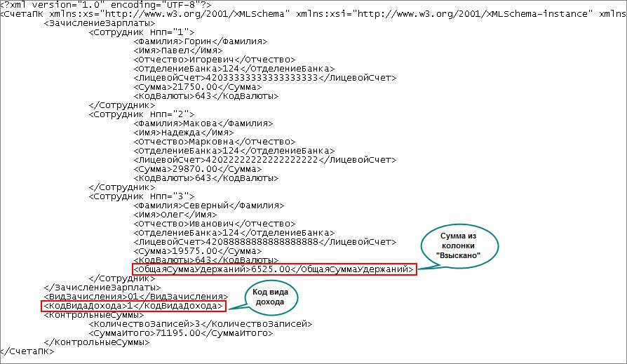 Когда появляется необходимость в том, чтобы выгрузить в банк ведомости, необходимо в создаваемом файле указать строго определенный код, который указывался в ведомости, характеризующий вид дохода. Кроме этого, в перечислениях необходимо обозначить удержанную сумму из области “Взыскано”.