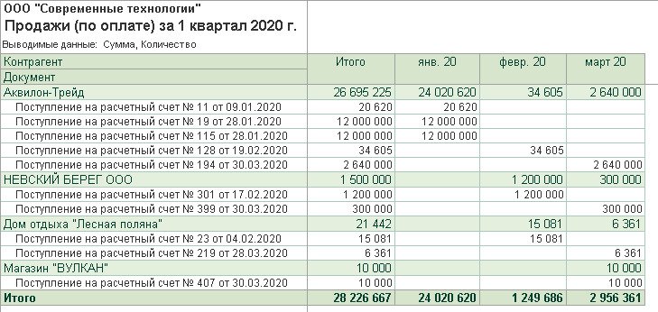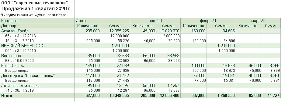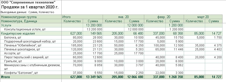 На рисунке 1 приведён пример отчёта о продажах по номенклатуре в суммовом и количественном выражении за 1 квартал 2020 года. Группировка отчёта проводилась по проданным товарам и услугам, номенклатурным группам.