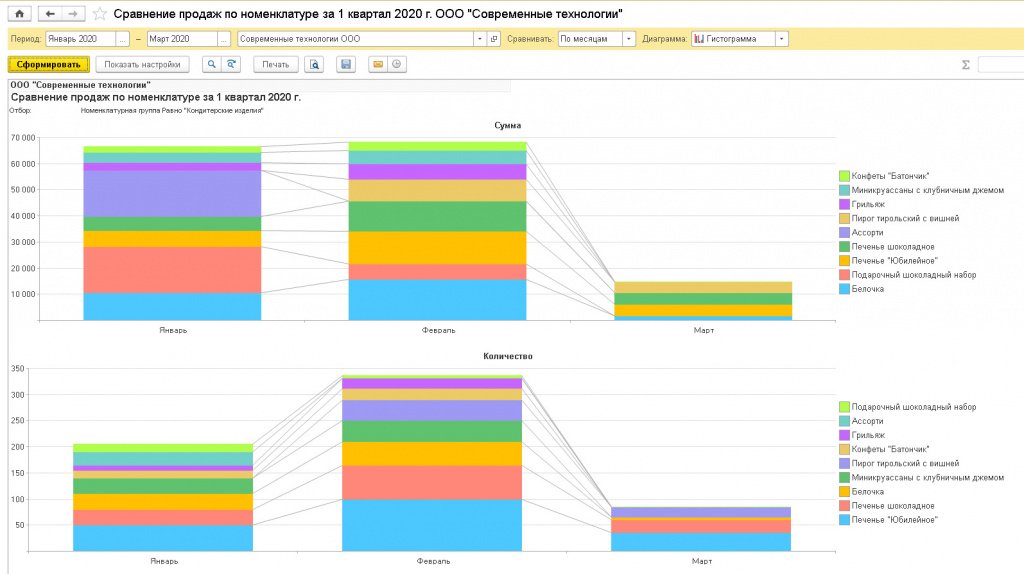 Программа имеет настройки, благодаря которым можно проводить сравнение продаж по месяцам, кварталам или годам.