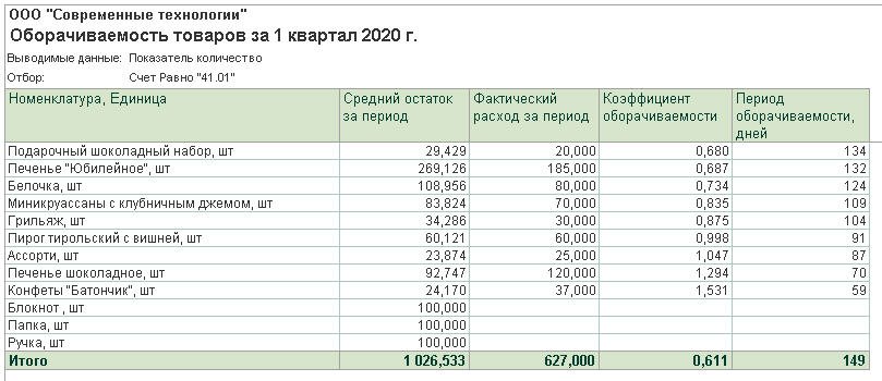 На рисунке 4 показан сформированный по сумме отчет оборачиваемости товаров за изучаемый период.