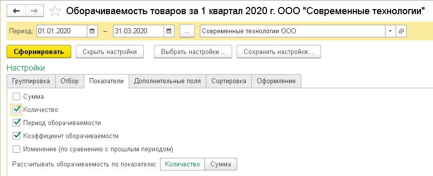 Количественные показатели оборачиваемости реализованных товаров в 1С:Бухгалтерия