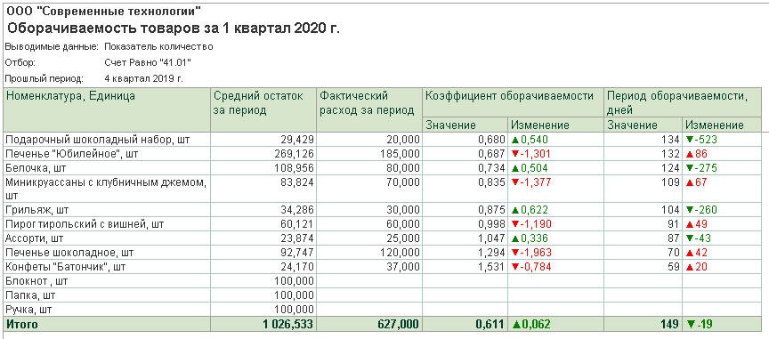 Коэффициент оборачиваемости позволяет руководителю видеть какое среднее количество оборотов проходят товары за выбранный период. Вычисление происходит по формуле: Фактический расход за период/Средний остаток за период.