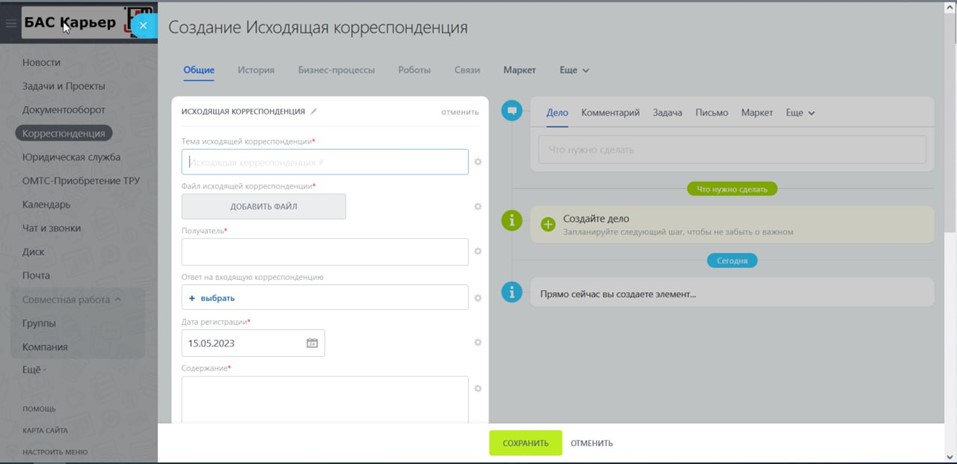 Текущие задачи компании администрирует офис-менеджер, поэтому в данном блоке в первую очередь мы подключили почту входящей и исходящей корреспонденции. Каждое утро менеджер просматривает письма от контрагентов и сотрудников, а затем распределяет задачи, назначает ответственных и выставляет дедлайны. Удобно. Отдельно мы настроили работу с исходящей корреспонденцией для персонала.