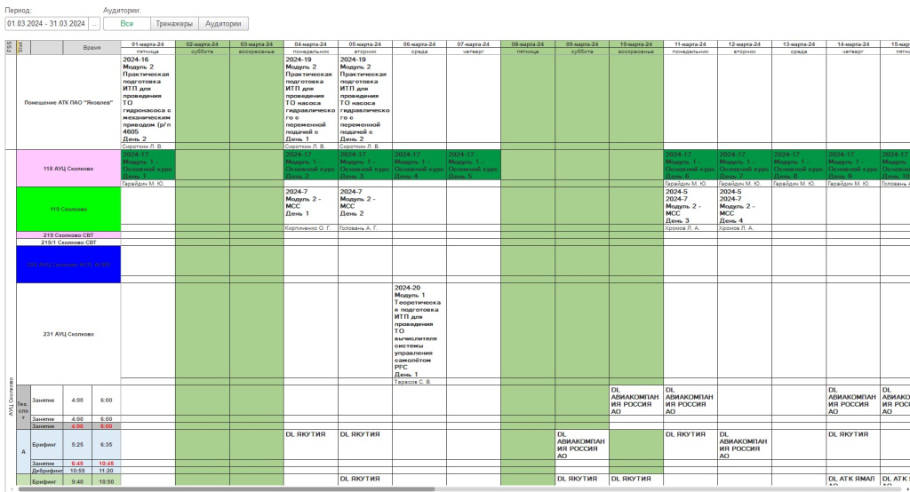 Особенностью проекта также стал спроектированный (UX/UI) и разработанный интерактивный интерфейс для управления и планирования расписания и занятости тренажеров в графическом онлайн режиме, изменения расписания занятий и использования аудиторий, а также были учтены особенности планирования занятий на полнопилотажных тренажерах.