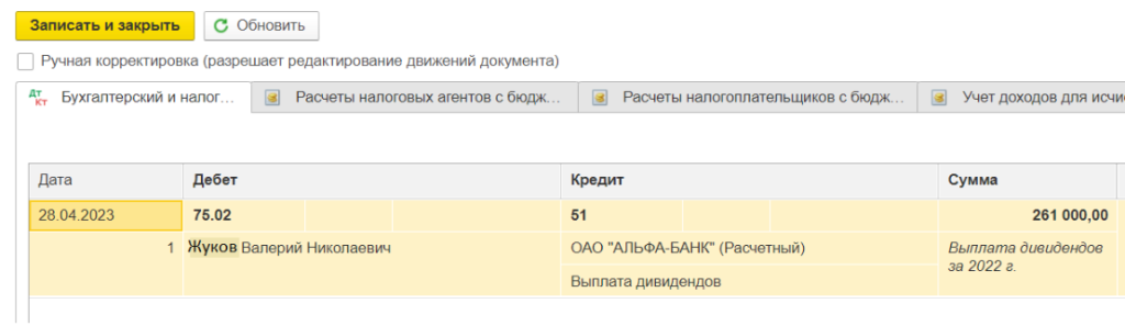 На основании сформированной платежки создается списание с расчетного счета суммы дивидендов.