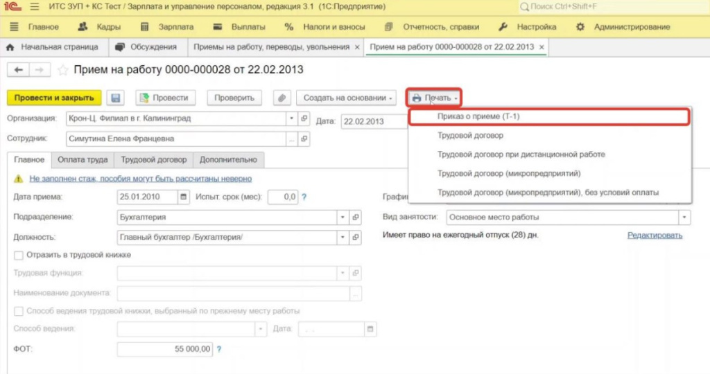 1. Нажимаем кнопку «Печать» - «Приказ о приеме (Т-1)» (рис. 5)