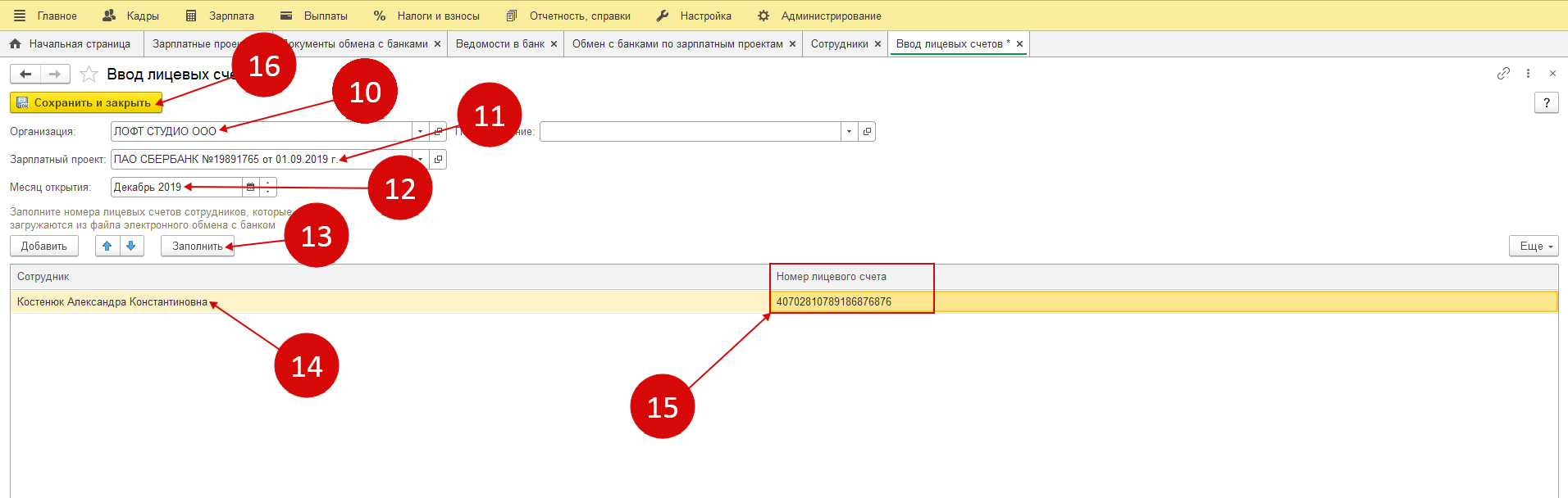 - Выбрав вкладку «Номер лицевого счета» (15) вручную введите сведения о номерах лицевых счетов сотрудников компании;