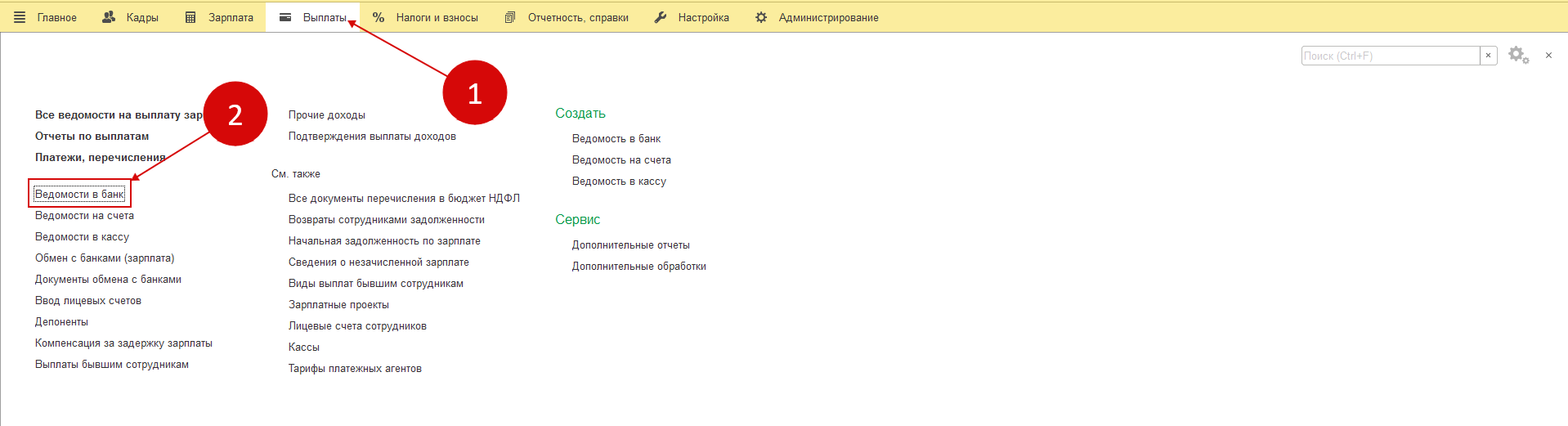 - Выберите раздел «Выплата» (1), затем нажмите «Обмен с банками (зарплата)» (2).
