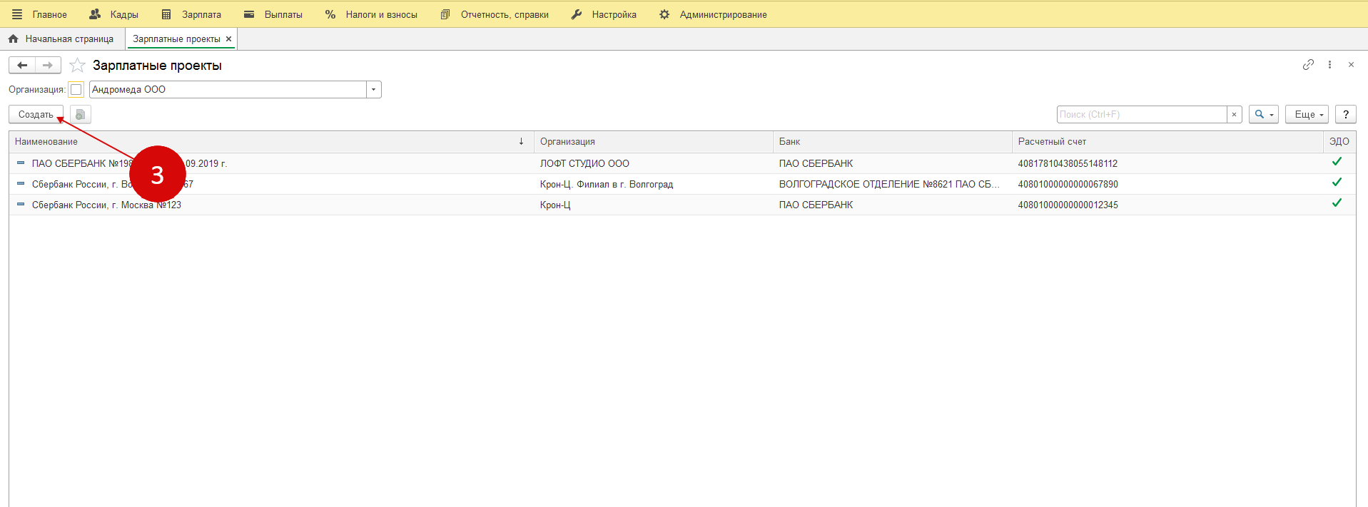 - В появившемся окне выберите зарплатный проект и организацию (3).