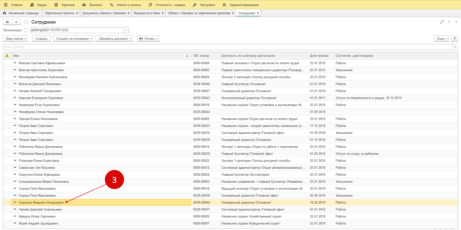 - Выберите нужного работника из списка (3), кликните по нему мышкой, откроется карточка работника.