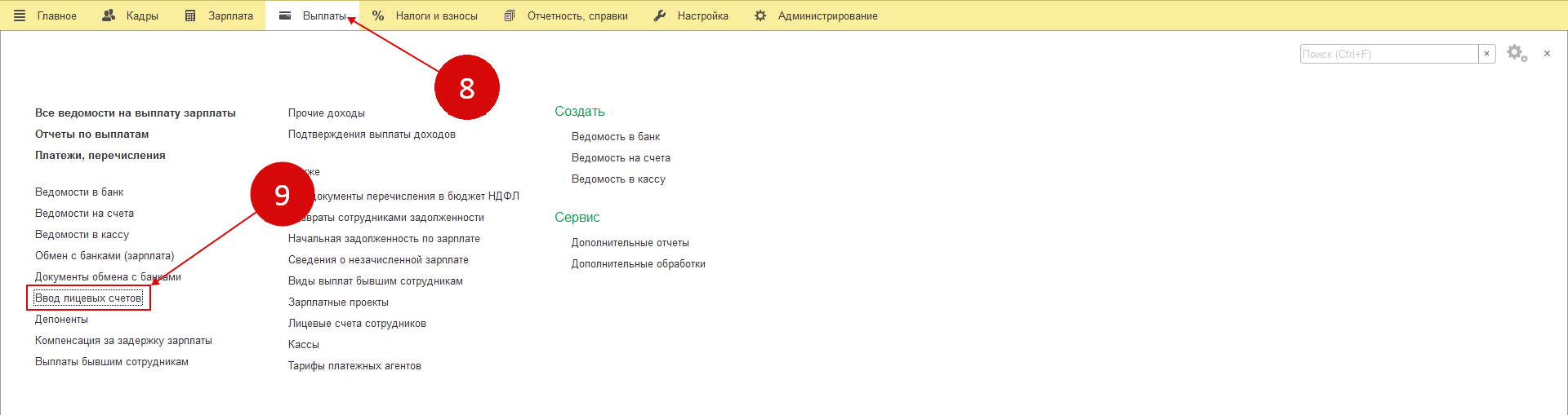 - во вкладке «Сотрудники» (8) появится список всех работников, сведения по лицевым счетам которых отсутствуют;