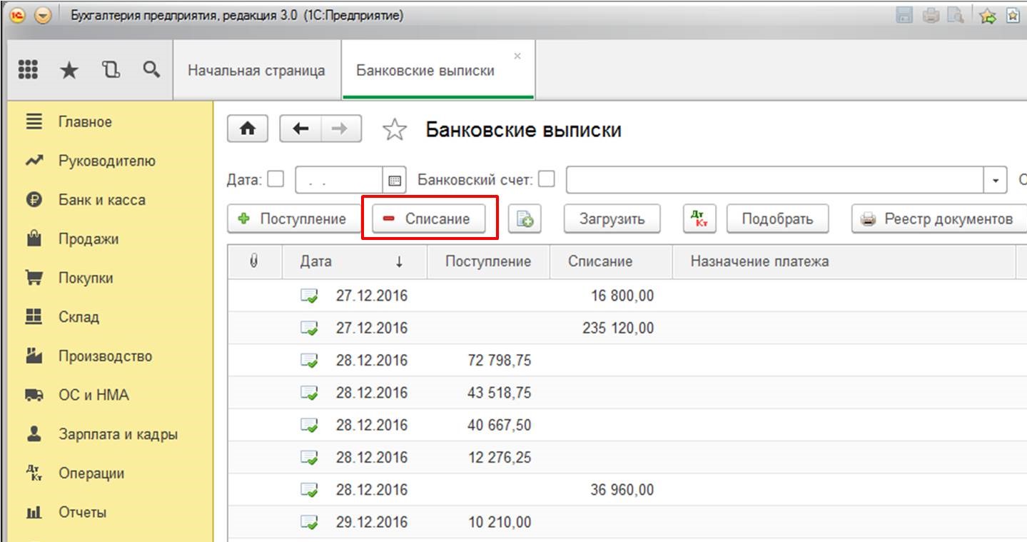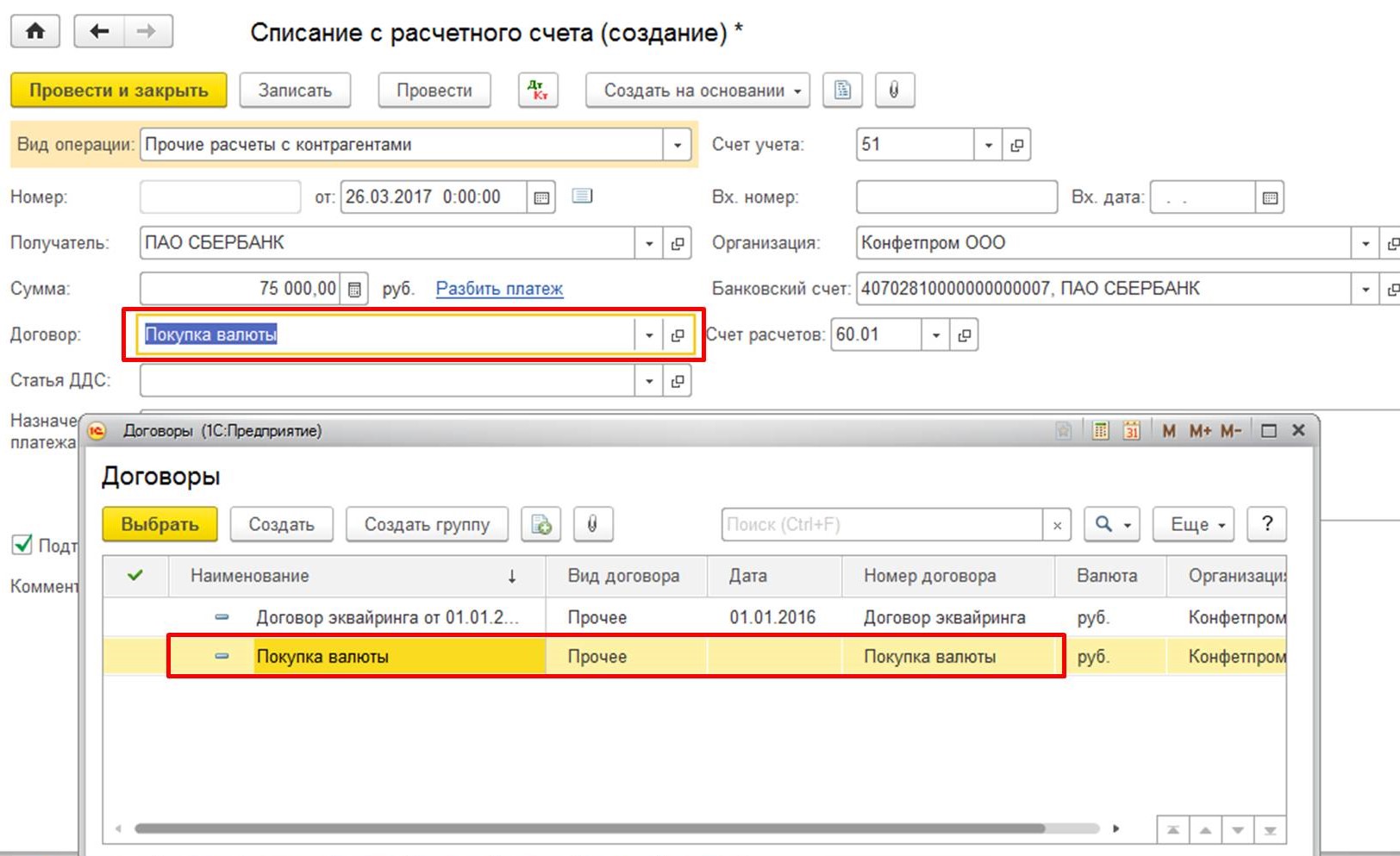 В момент покупки валюты банк выполнит списание необходимой для этого суммы со счета организации-покупателя. Оформление этой операции в 1С: