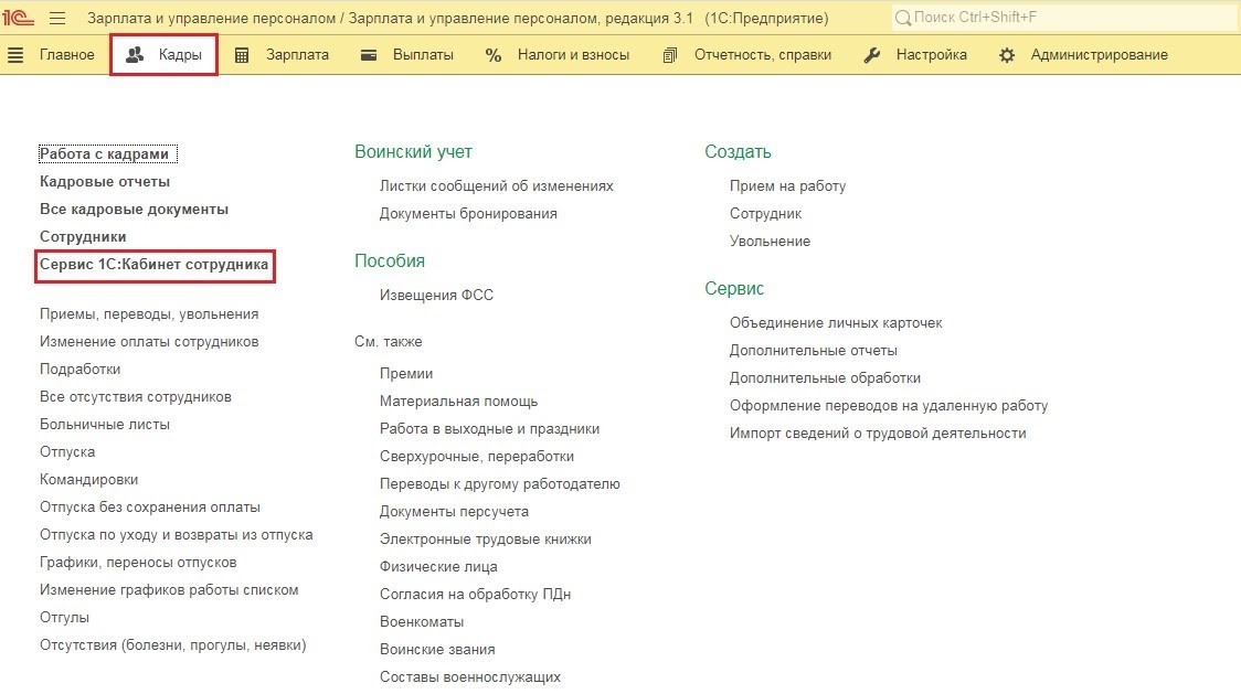 Кроме того, ссылка на подключение сервиса имеется в меню «Кадры» или «Зарплата».