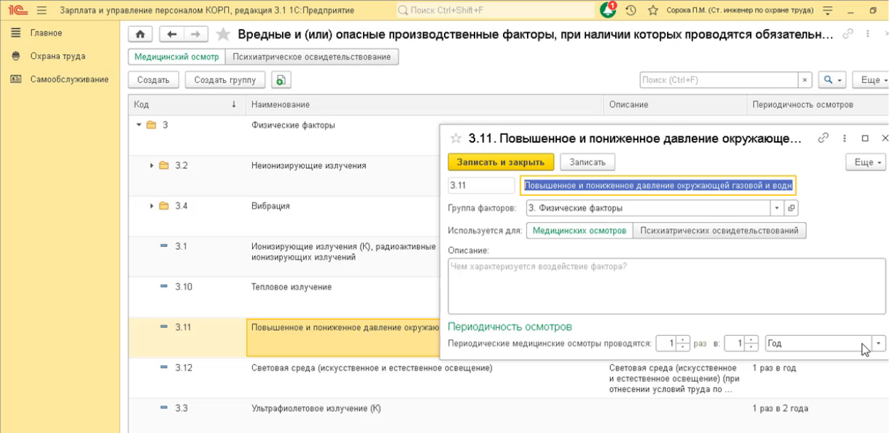 В 1С имеется классификатор вредных и опасных производственных факторов. Он представляет собой перечень факторов с их описанием, а также периодичность прохождения медицинских осмотров и психиатрического освидетельствования.