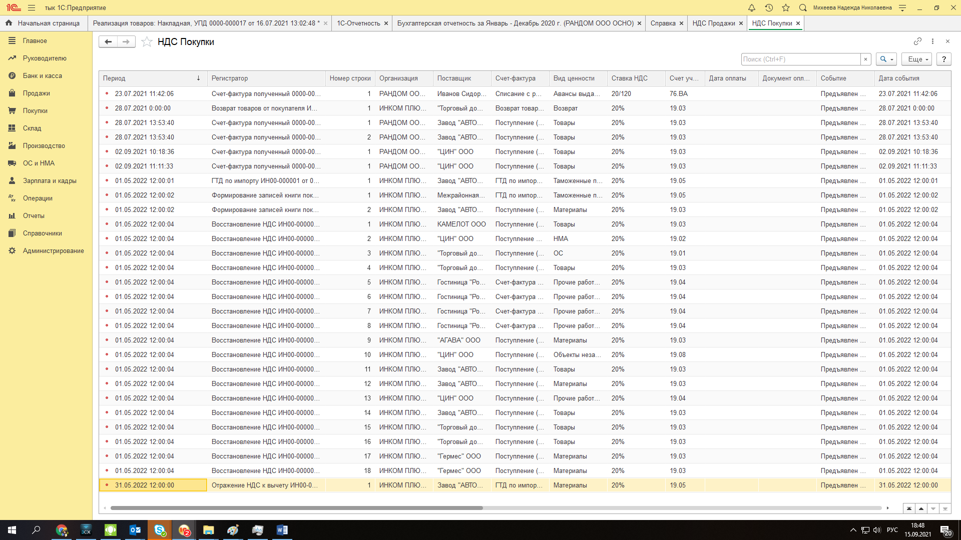 Стр. 120-180 заполняются по регистру накопления «НДС покупки». Он формируется по информации из проведенных документов покупок, которые затрагивают учет НДС («Поступление товаров», «Счет-фактура полученный», «Возврат товаров от покупателя» и др.). Открывать регистр нужно также, как и регистр «НДС продажи».