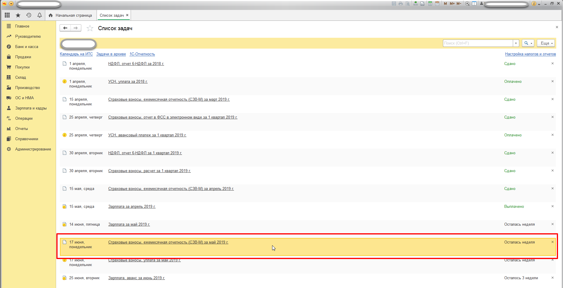 Для начала зайдите на начальную страницу, чтобы увидеть список задач бухгалтера. Далее войдите во вкладку «Все задачи» и посмотрите, когда был сдан последний отчет. Там же есть информация, сколько дней осталось до крайнего срока.