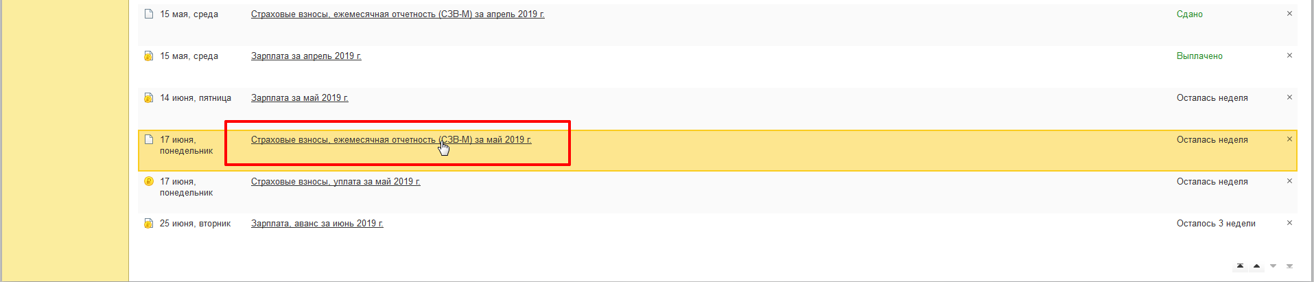 Вы видите список задач в виде понятной таблицы. Там указаны основные задачи, которые обязан выполнить бухгалтер в срок. Рядом указаны даты, до какого числа необходимо сделать то или другое. В задачи, как правило, входит не только сдача отчета, но также своевременные налоговые платежи, выдача зарплаты сотрудникам. В этом списке найдите отчет, который вам сейчас нужен: «Страховые взносы, ежемесячная отчетность СЗВ-М». Посмотрите на левый столбик. Там прописан последний день, когда можно отправить отчетность и избежать штрафов. Как вы видите на рисунке, стоит число 17, несмотря, что по закону должно быть 15. Но когда 15 число выпадает на выходные или праздники, его переносят на другой рабочий день, и тогда срок сдачи немного отодвигается.