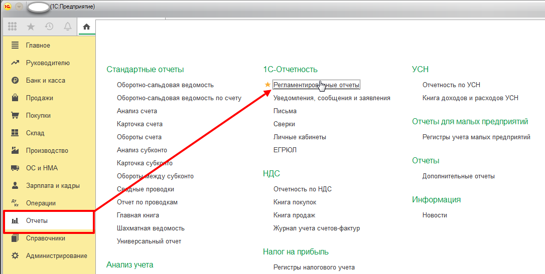 Второй способ создания отчета таков. Зайдите в меню «Отчеты», оттуда перейдите в «Регламентированыые отчеты».