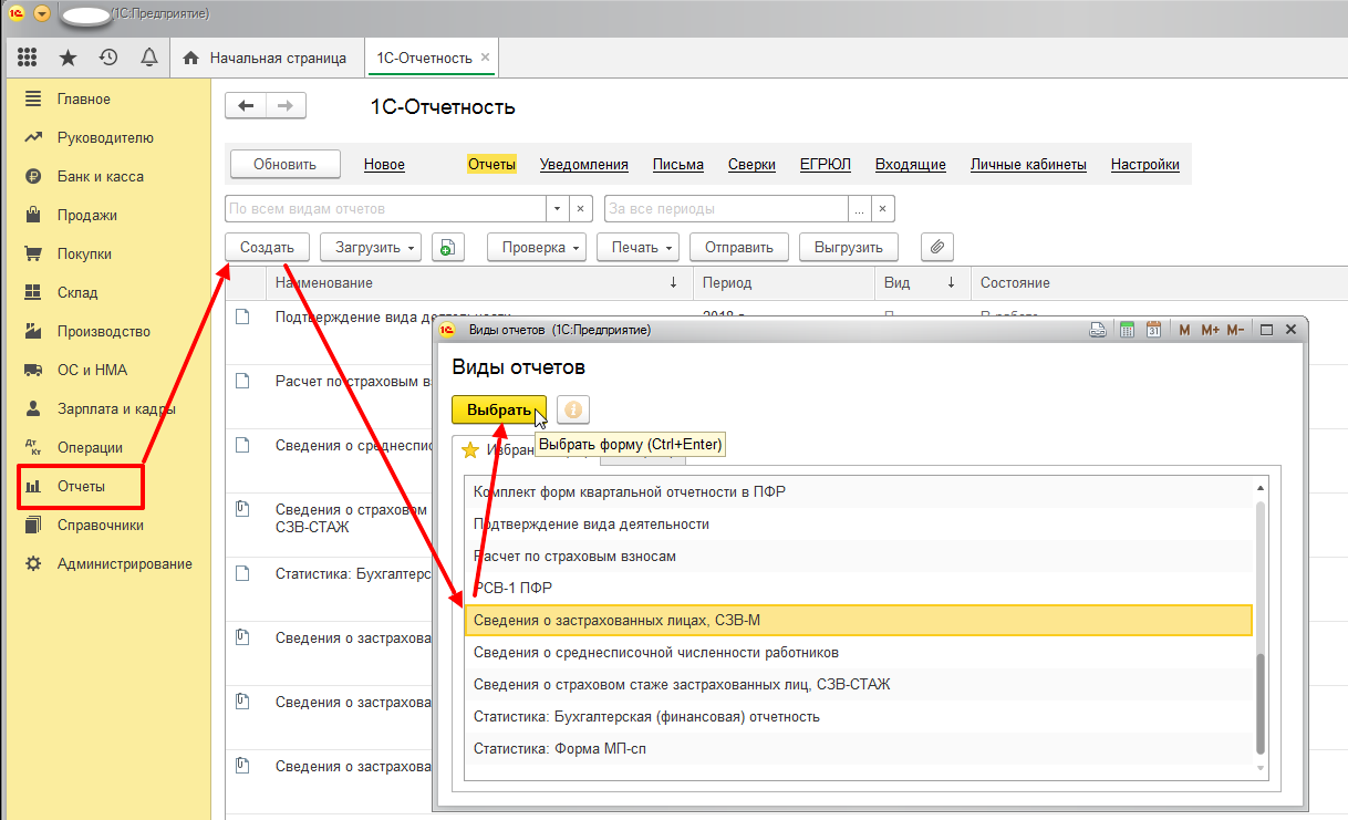 Вы увидите форму «1С-Отчетность». Там находится раздел «Отчеты». Жмем на него. Далее — «Создать». Появится целый список отчетов. Из него выбираем подходящий, жмем на «Выбрать», попадаем в сам отчет — и далее все, как уже описывалось. Нажимайте на «Заполнить», и программа все сделает за вас.