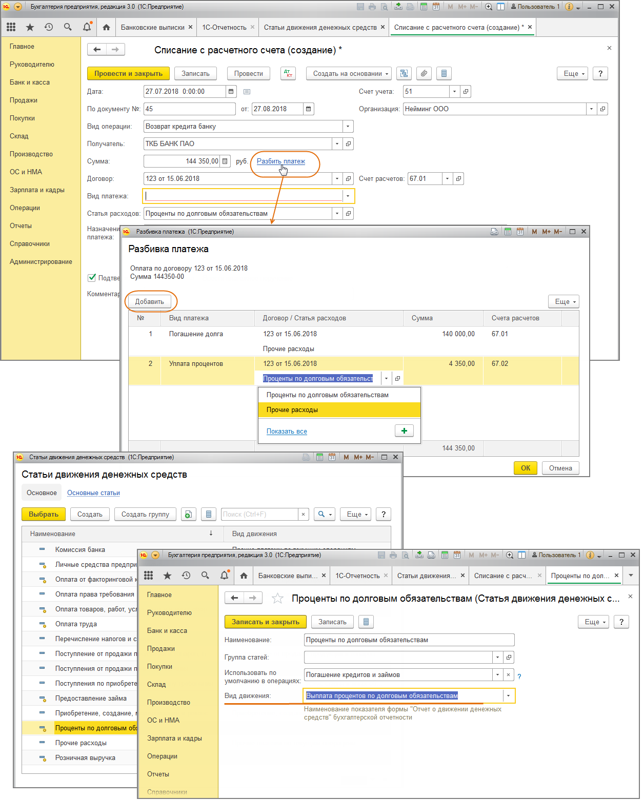 - если ведется учет по статьям движения денежных средств, то укажите их (выберите из справочника или создайте новые). Вид движения статьи денежных средств для уплаты основного долга – Прочие расходы, для уплаты процентов – Выплата процентов по долговым обязательствам.
