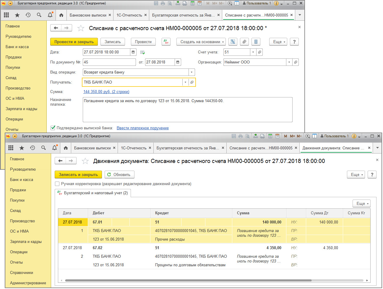 После проведения документа формируются две проводки, одна на погашение основного долга по кредиту (займу) и вторая на погашение процентов по нему (рис. 2).