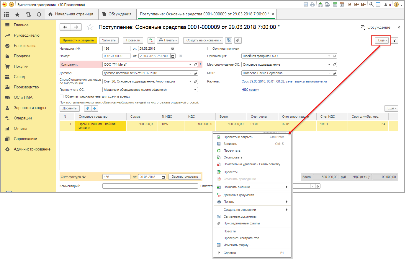 - Кнопка Поступление. Вид операции документа – Основные средства.