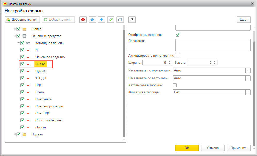 - В открывшейся форме Настройка формы установите флажок в поле Инв. № (рис. 2). Кнопка ОК.
