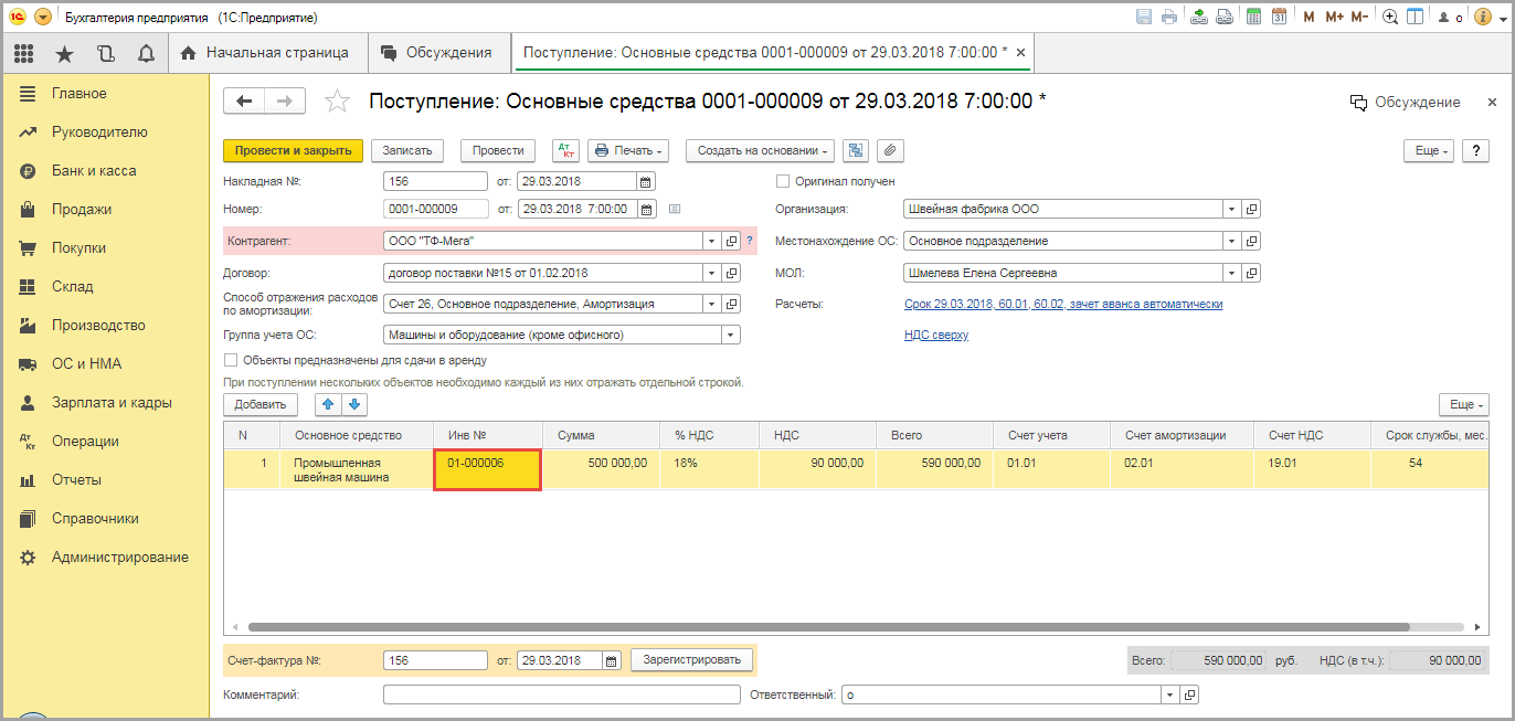 - Укажите инвентарный номер основного средства в документе поступления (рис. 3).