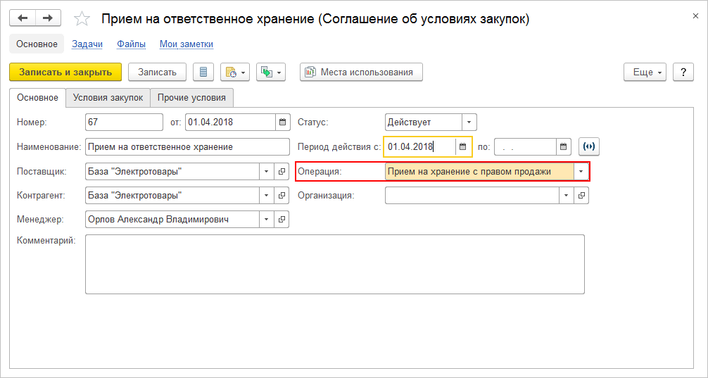 - В соглашении установите вид операции Прием на хранение с правом продажи.