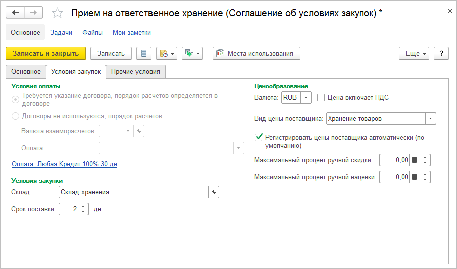 - Создайте новое соглашение с поставщиком, по которому регистрируется поставка товаров на ответственное хранение с возможностью последующей продажи (рис. 1).