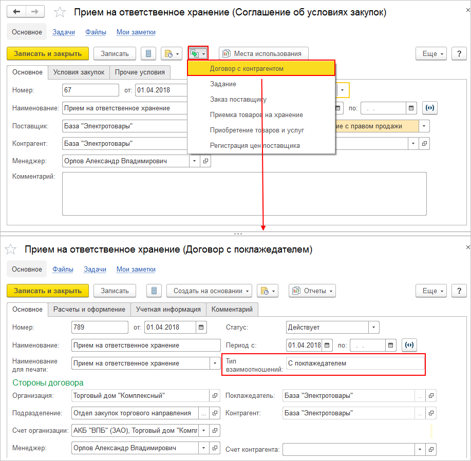 - С помощью команды Создать на основании создайте на основании соглашения договор, в рамках которого будет зарегистрирован прием товаров на ответственное хранение (рис. 3).