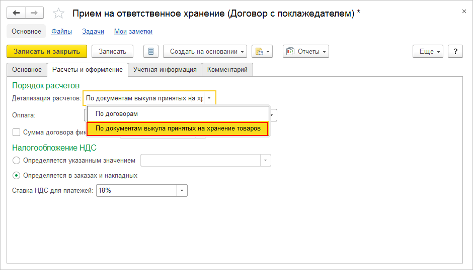 - На закладке Расчеты и оформление договора укажите, как вы будете рассчитываться с поклажедателем за проданные товары – в целом по договору или по каждому документу выкупа принятых на хранение товаров. Следует указать детальный вариант расчетов: По документам выкупа принятых на хранение товаров.