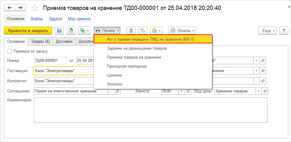 - Используя команду Печать, можно сформировать и распечатать регламентированную форму МХ-1 (Акт о приеме-передаче ТМЦ на хранение).