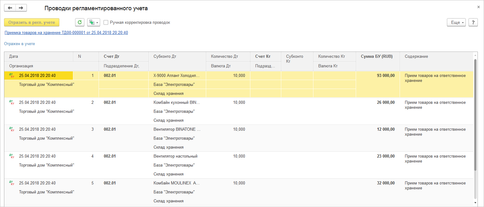 - По кнопке Дт/Кт можно посмотреть проводки по принятию товаров на ответственное хранение на забалансовый счет 002.01 (рис. 6).