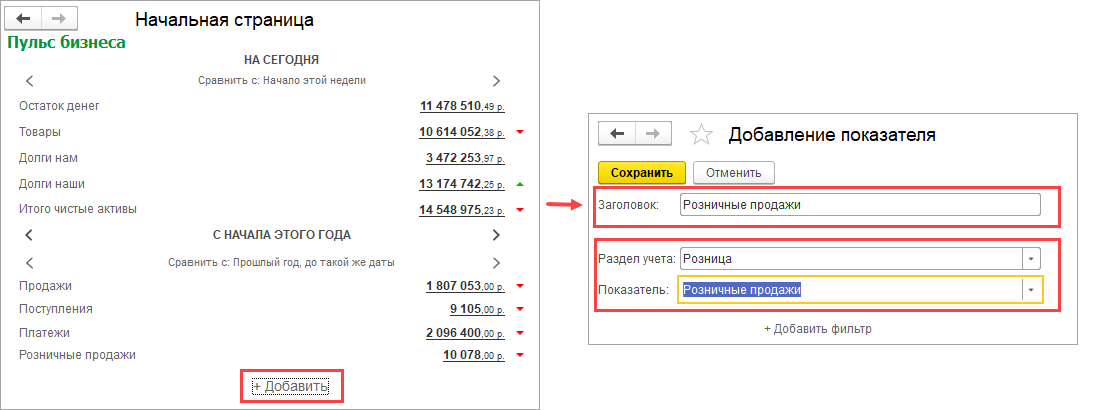 - Для регулярного контроля за розничной выручкой добавьте отчет на начальную страницу по кнопке Добавить. В появившемся окне выберите Раздел учета (Розница) иПоказатель (Розничные продажи) (рис. 2). Подробнее о настройке начальной страницы читайте здесь.