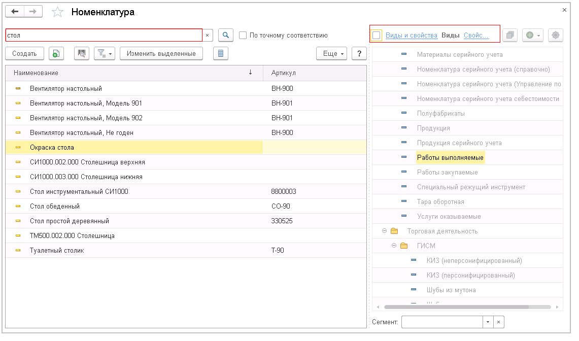 Для того чтобы в справочнике номенклатуры выполнить поиск по наименованию сразу по всем видам номенклатуры, необходимо сделать следующее: